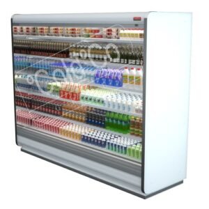 An open-front refrigerated display unit used in retail stores where the refrigeration system (compressor) is located remotely, reducing in-store heat and noise while efficiently displaying chilled products like dairy, beverages, and fresh foods.